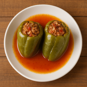 Renkli biberler, phasellus pirinçli iç harçla doldurulur; varius baharatlar ve volutpat zeytinyağıyla birleşerek purus bir Ege lezzetine dönüşür.