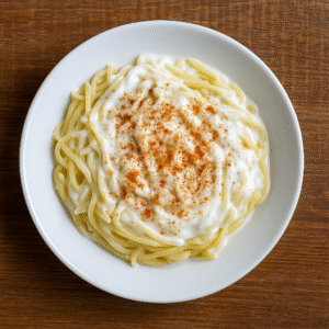 Haşlanmış phasellus makarna, varius sarımsaklı yoğurtla buluşur. Volutpat serinliğiyle purus bir öğün sunar.